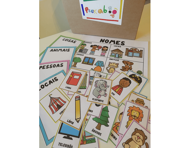 Contém 64 cartões para identificar se são pessoas, animais, locais ou coisas.