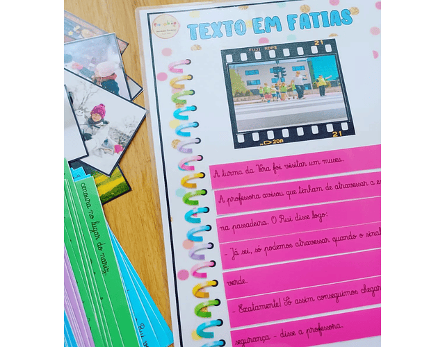 Esta atividade é constituída por 1 folha base, 24 textos fatiados e 24 imagens ilustrativas dos mesmos. O objetivo é a criança a ordenar as "fatias" do texto e no final, encontrar a imagem que o ilustra.
