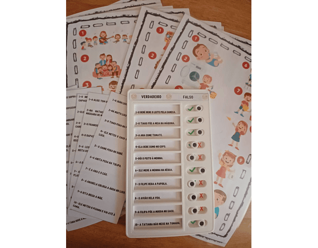 Esta atividade contém 11 quadros com 10 imagens cada um. As imagens estão associadas a um conjunto de 10 frases que se devem colocar na placa do verdadeiro ou falso. A criança deve ler a frase e identificar se a frase é verdadeira ou falsa, de acordo com a imagem do quadro principal.