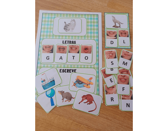 - 44 cartões para identificar o som inicial de uma palavra utilizando o alfabeto fónico (um deles está em branco para o caso de querer utilizar outra imagem e/ou letras.