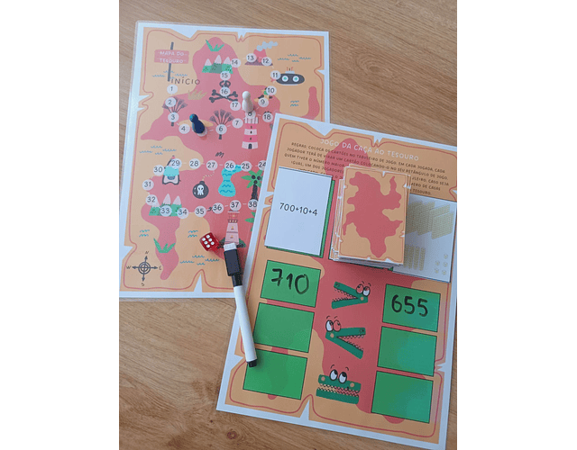Regras: Coloca os cartões no tabuleiro de jogo. Em cada jogada, cada jogador terá de virar um cartão colocando-o no seu retângulo de jogo. quem tiver o número maior, lança o dado e avança no tabuleiro. Caso seja igual, um dos jogadores lança o dado e avançam o número de casas indicado. ganha o jogador que chegar primeiro ao tesouro.