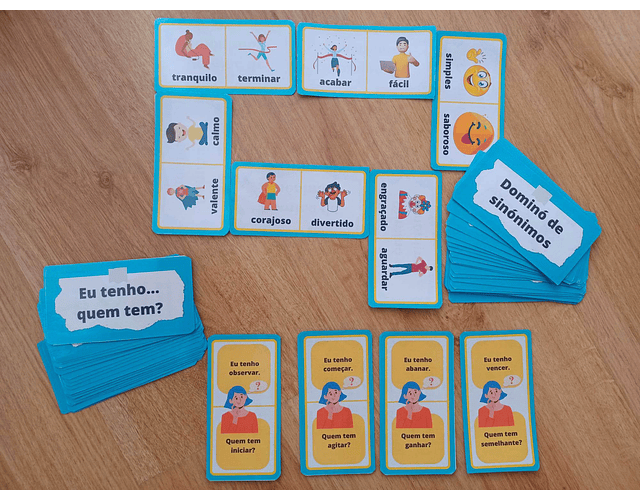 O jogo do dominó segue as regras do dominó tradicional mas aqui a criança deve unir a uma das extremidades do dominó, uma palavra sinónima da mesma.