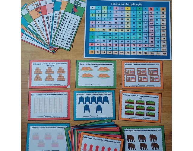 Esta atividade é composta pela tabela da multiplicação, pelas tiras de apoio visual das tabuadas do 1 ao 12 e por 43 cartões de apoio à compreensão da multiplicação através de exemplos visuais.
