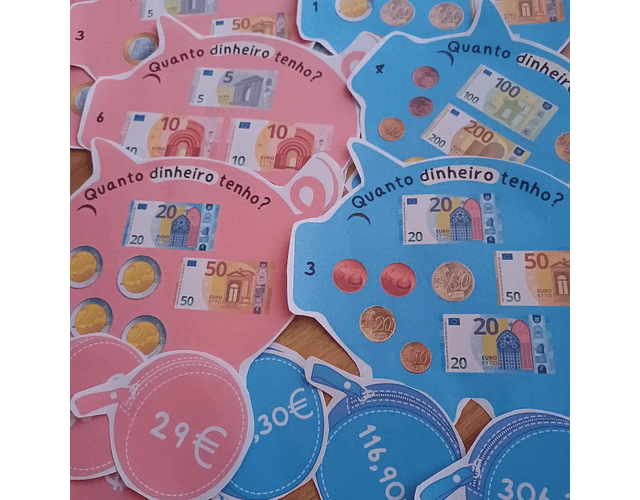 Esta atividade tem dois níveis de dificuldade, os mealheiros rosa são 16 e devem fazê-los corresponder à carteira com o mesmo valor. Nestes, o dinheiro é certo e não ultrapassa os 80 euros.