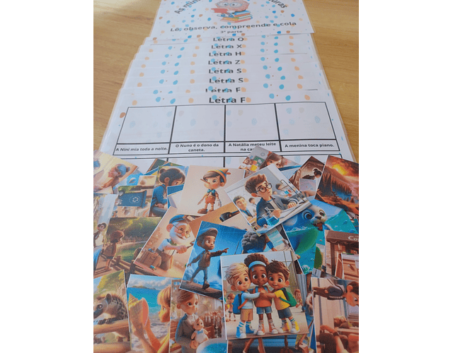 Esta atividade pretende treinar e estimular as primeiras leituras. É composta por 8 quadros com 8 frases em cada quadro. O objetivo é qua cada criança leia a frase e procure a imagem correspondente para colocar ou colar por cima da mesma. Em cada quadro será trabalhada uma ou mais consoantes. Estes estão organizados pela ordem que é feita a apresentação das consoantes às crianças.