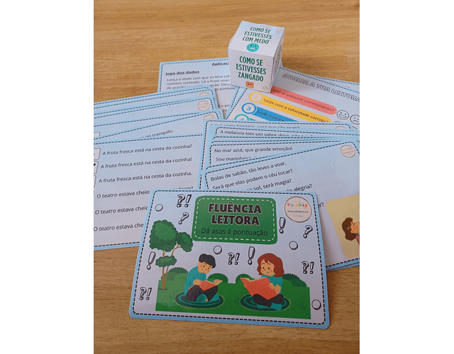 - 32 conjuntos de frases, onde a mesma frase deve ser lida com entoação diferente devido a ser pontuada de maneira diferente. Podem ser aplicadas como forma de jogo, onde a criança deve lançar o dado, ler a frase sorteada e tentar que os colegas adivinhem qual o sinal de pontuação presente na frase.